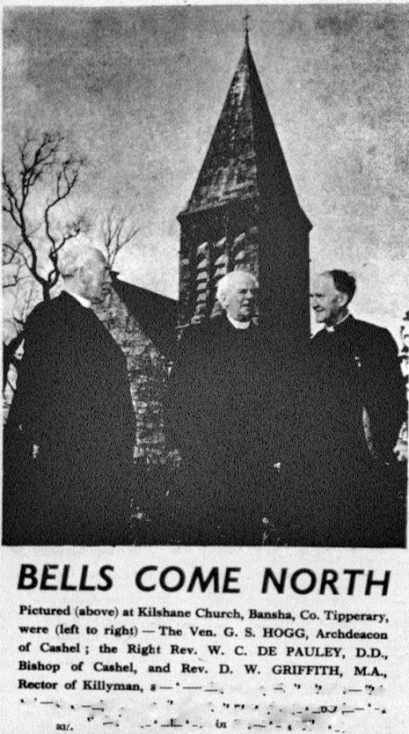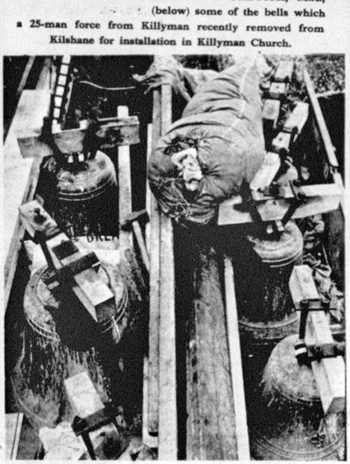The following article appeared in the “Nationalist” a Tipperary newspaper tells the story of the Killyman visit which created quite a sensation in the town and neighbourhood: On Monday last at Kilshane near Tipperary town there was a highly unusual do-it-yourself operation carried out in record time by a task force of some 25 stalwarts who came 200 miles from over the border. The men, mostly farmers but including some artisans and labourers and two company directors, were all members of the Church of Ireland parish of Killyman, near Dungannon in Co.Tyrone. For some time they’ve had a problem up there in the North-the bell in Church of St Andrew was cracked and has hung silent ever since, Meanwhile, down south in Kilshane there was a peal of eight bells which have also hung silent for years because the lovely little church there on the former Low estate was closed for public worship in March, 1961, and its consecration removed in 1964, Since St Andrews in Killyman needed a bell and Kilshane didn’t, the Church of Ireland authorities arranged for a transfer. I am told that at one stage the possibility of transferring the bells to Tipperary town was considered, but the estimate for having this done was decidely off- putting. The Killyman people solved that problem by doing it with voluntary workers-some however, with considerable experience of the work involved.Rev, D.W.G. Griffith Rector of Killyman, who led the operation, told me that having journeyed to Tipperary at the week-end they started in Kilshane at 8 a.m, on Monday and with an hour and a half off for lunch, they had the bells loaded on a lorry and everything cleared up by 4.30 p.m.Considering that it had been estimated that the job might take four days and that the eight bells high in the steeple weighed a total of two tons, they had every right to be pleased with their achievement. The visitors availed of the unexpected free time which their success afforded them to do some sight- seeing in the district, but reassembled at Kilshane Church on Tuesday afternoon where they were greeted by the Bishop of Cashel,Right Rev: W.C.de Pauley,DD, and the Archdeacon of Cashel, Venerable G.S. Hogg, Tipperary. Later the visitors were guests at a reception in Tipperary where they met the local Church Wardens and Select Vestry. On Wednesday morning the truck set out from Tipperary to bring the bells 200 miles to their new home. Mr Mervyn Potts was driver and was accompanied by Mr Jim Hayes. When they got there, Mr Fred Dukes, who is secretary of the Bell Ringers Association, will supervise the work of rehanging and re-tuning the bells. They are over 100 years old and were donated to Kilshane by the Low family who once occupied the residence.