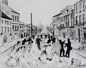 ‘However, as the processionist advanced, the line of police drew to one side and allowed them to pass. All the party, however, did not march forward, a large body remaining in Irish street and other portions of the Catholic quarter. The police at Church Street, thinking the whole procession had passed, followed pretty close upon the rear, so as to prevent any disturbance that might arise from a collision between the two factions, and also to guard against the possibility of an attack being made upon the Wesleyan Methodist Chapel, situated farther down the street. For a few minutes, it seemed as if all we’re about to pass off peaceably when suddenly a scene of dire confusion ensued. So far as can be gathered from a careful sifting of various accounts, it appears that the procession was marching gaily by, flaunting their banners, one of which bore the names of the heroic achievements formerly inscribed upon the colours of the Irish Brigade, and playing enlivening national airs, when one of some half dozen Orangemen that had collected on the pavements rushed forward and endeavored to burst in the head of the big drum. At once he was set upon by the bandsmen, and several of his comrades running to his assistance, in another second there was a general melee, although, as might be imagined, no doubt could exist as to which side would be victorious. Not satisfied with protecting themselves and their property, the Catholics commenced to smash the glass in the windows in the houses in the street, and for some time the greatest consternation prevailed. As many of the inhabitants as could hurriedly put up their shutters, for many remembered the “sack of Listamlaght’’ and feared that it was about to be indiscriminately avenged by mob violence’[8]
